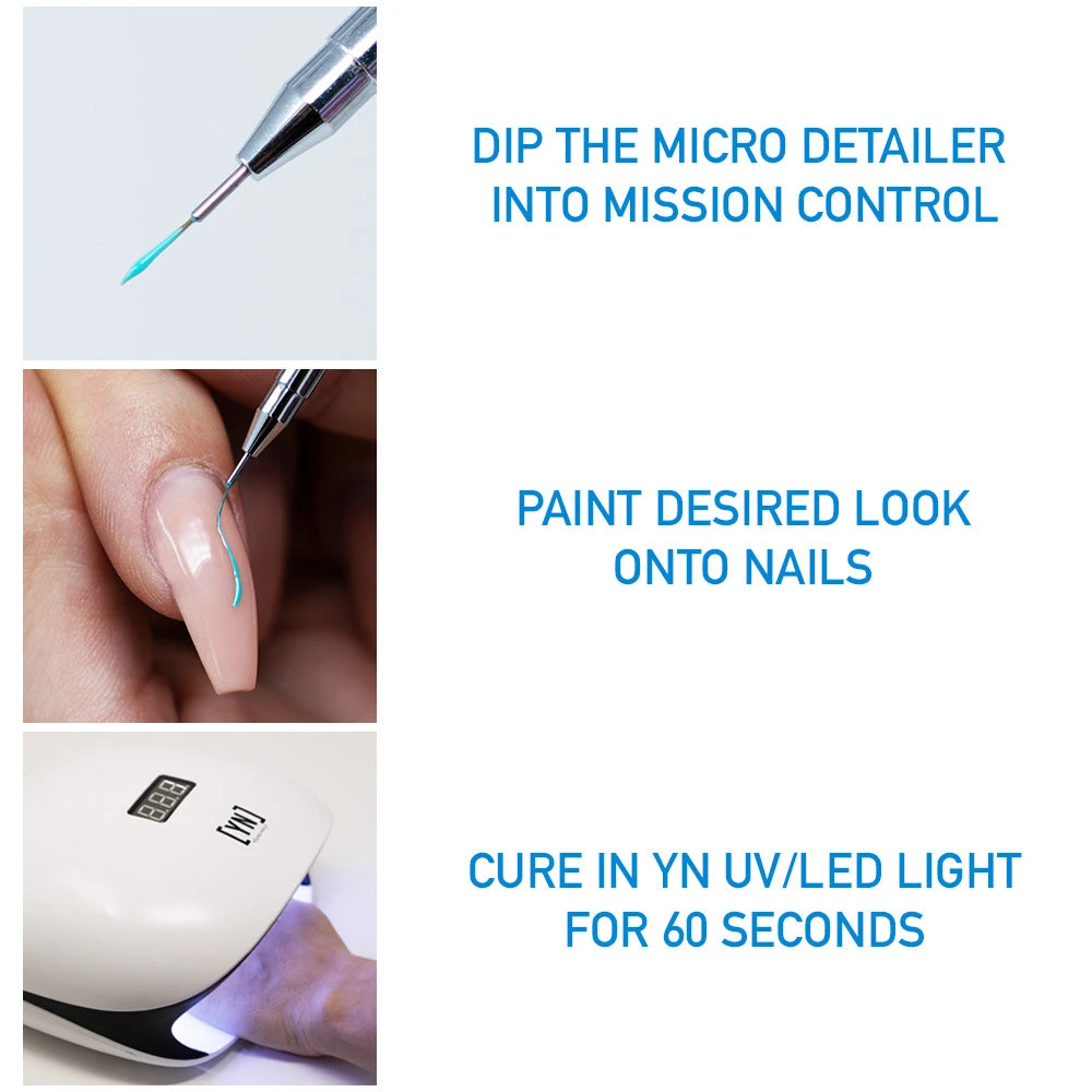 Nail artists are now in complete command. Create beautifully intricate line art with Young Nails Mission Control, Precision Gel Paint. Master the details and achieve total control over nail art when you use our exclusive gel paint formula for a super shine, rich pigmentation, advanced viscosity, easy workability, and a cure with zero tacky layer. Available with 12 intense colors and the Micro Detailer Brush.